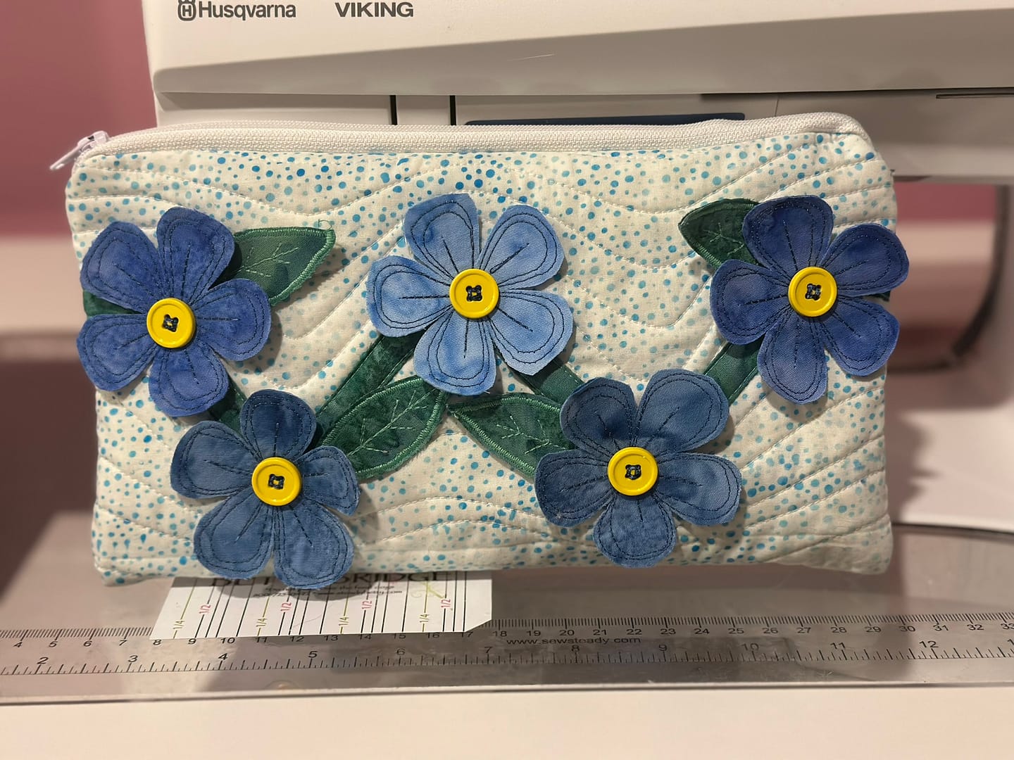 This Forget-Me-Not design is finished as a 5″ x 10″ zipper pouch featuring clustered blossoms, dimensional leaves, and button-fastened petals.