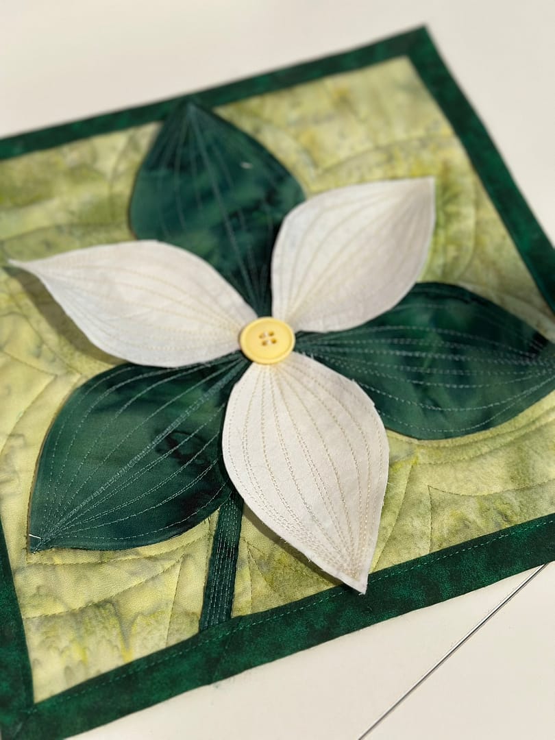 This Trillium block is finished as a small mini quilt with binding—perfect for display or gifting.
