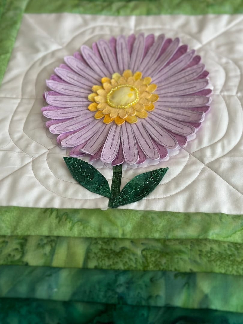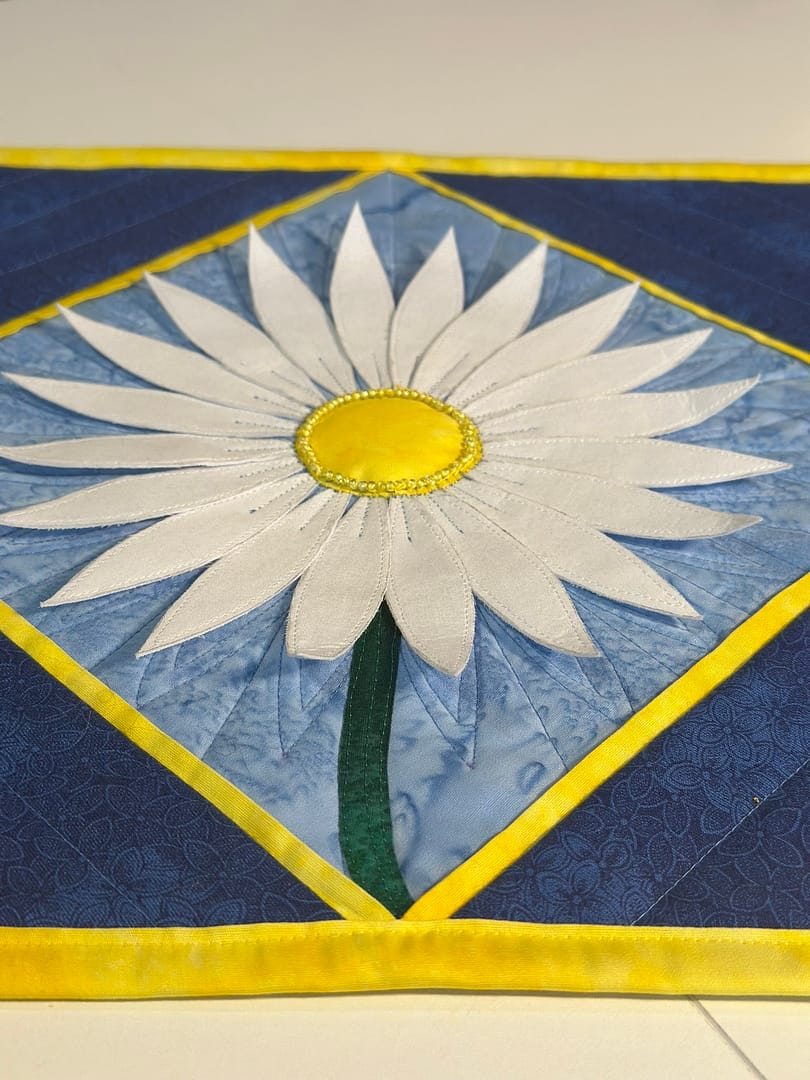 This Daisy block is finished as a mini quilt featuring a padded center, optional beading, and a flanged on-point border for a polished look.