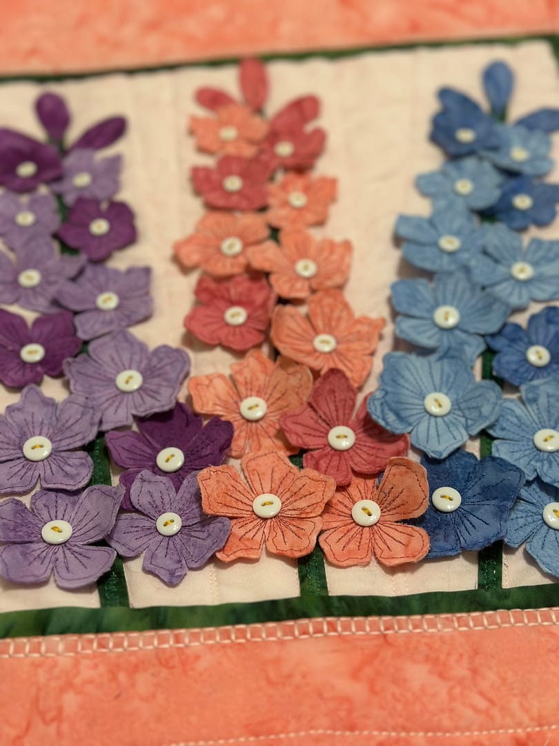 This Larkspur design is finished as a mini quilt featuring clustered blossoms, button-fastened petals, and a flanged border with decorative stitching details.