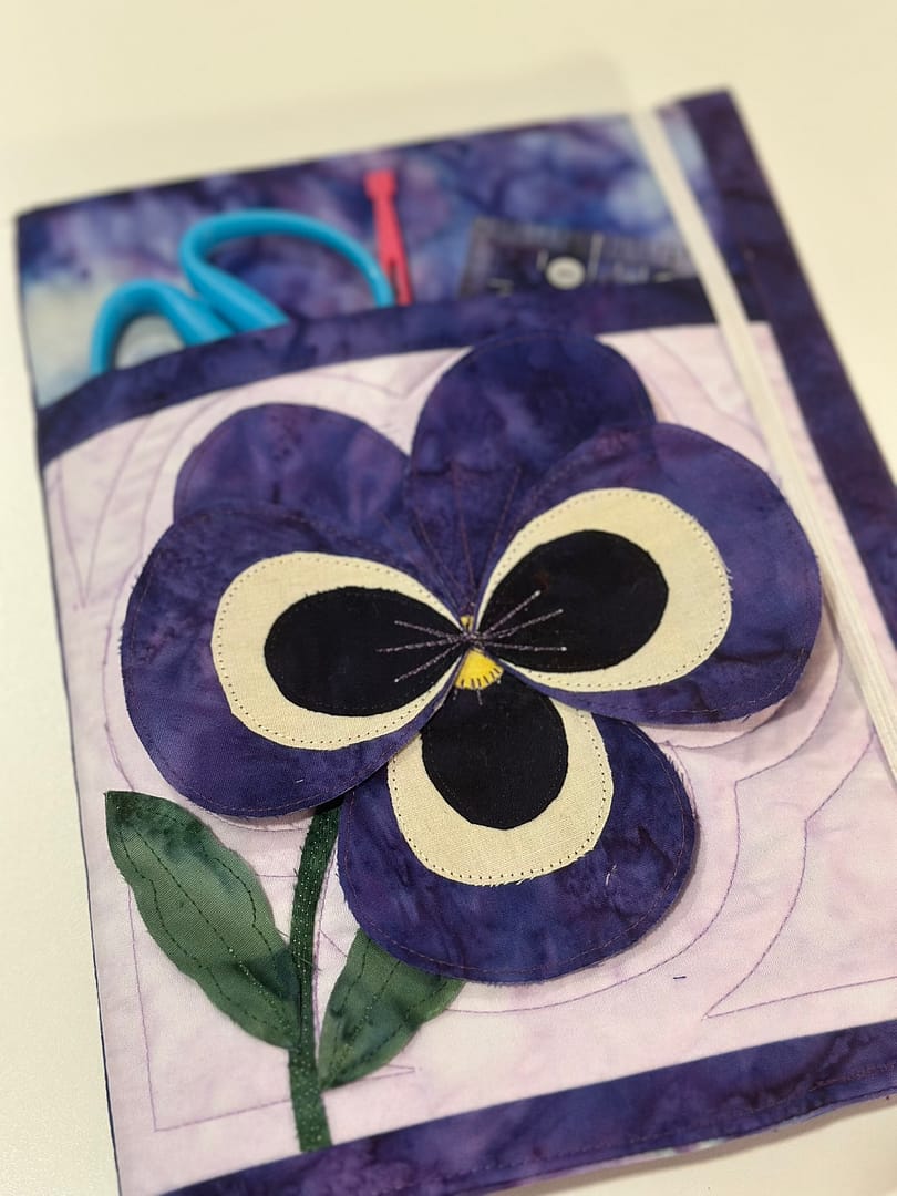 This Pansy block is finished as a composition notebook cover—both decorative and functional.
