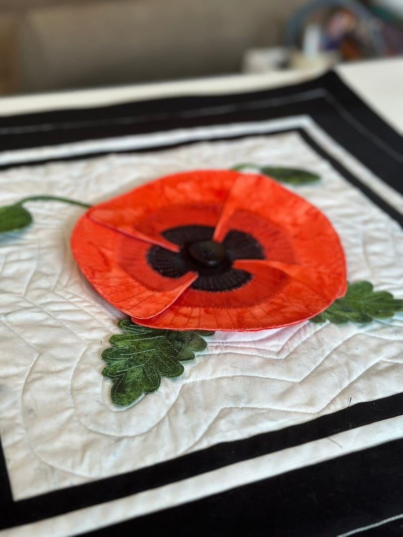 This Poppy block is finished as a mini quilt with a wide border and modern quilting details, using a faced finish for a clean, contemporary edge.
