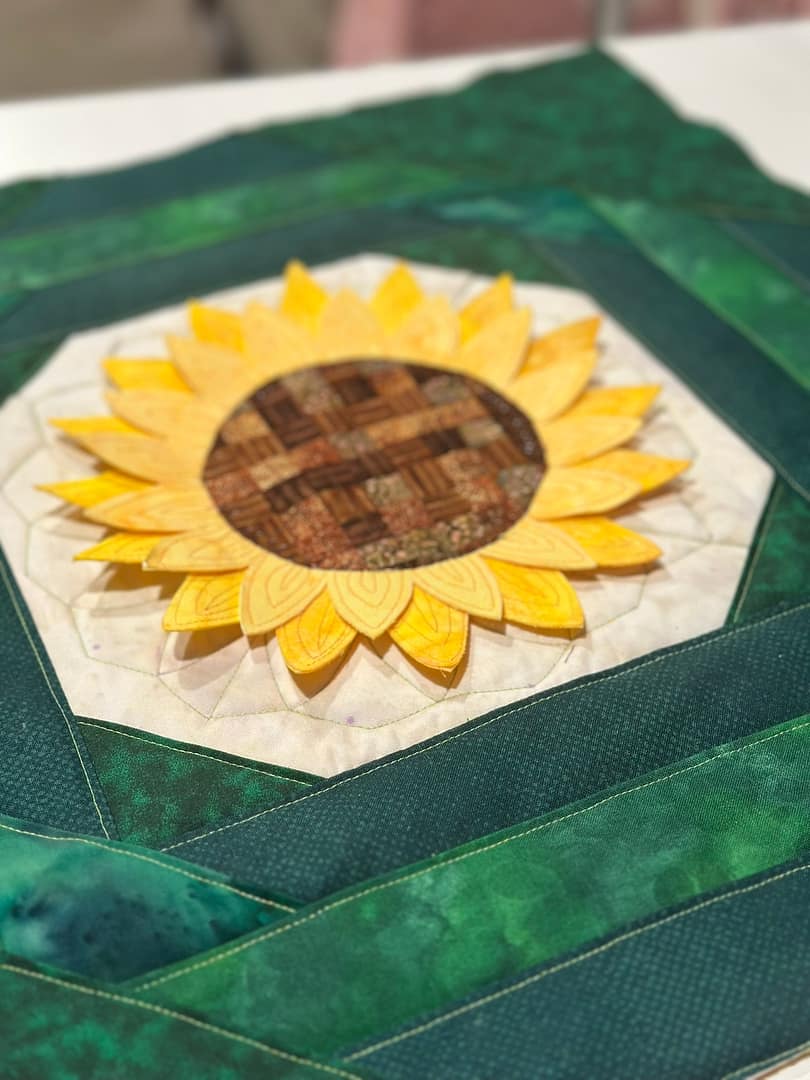 This Sunflower block is finished as a small wall hanging featuring a woven center, layered petals, and a pineapple border for a dynamic, eye-catching design.