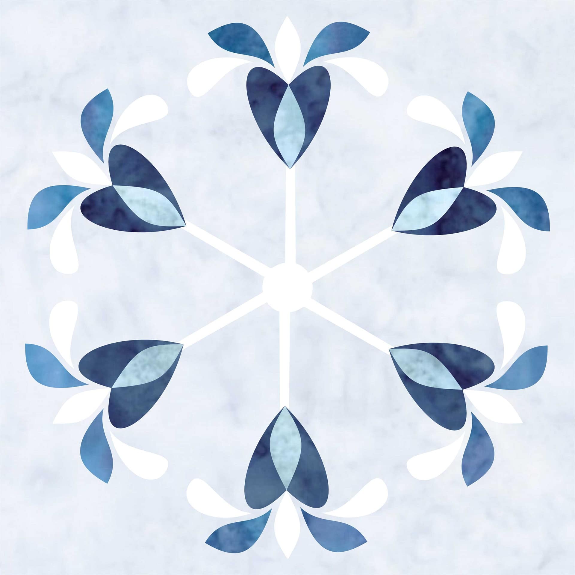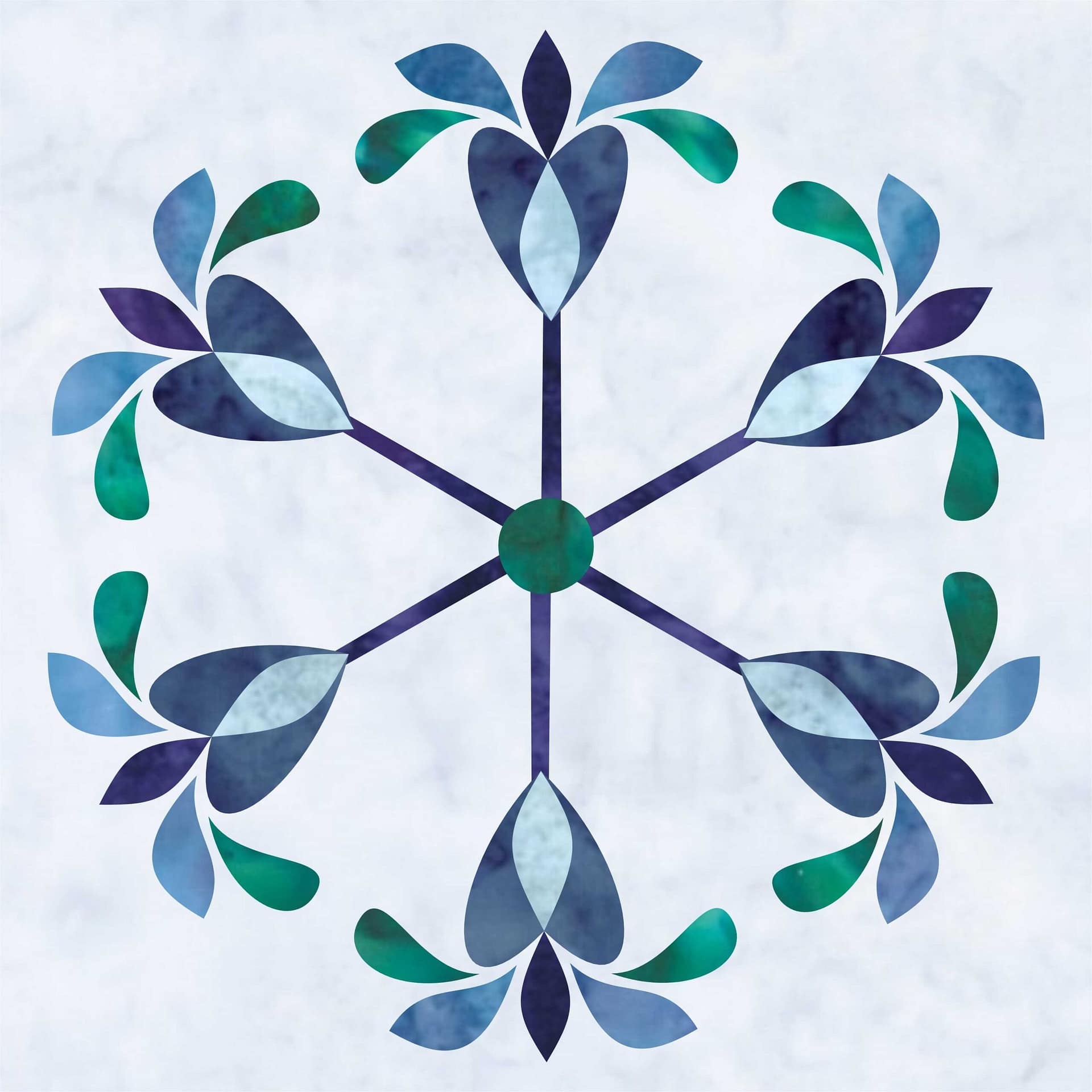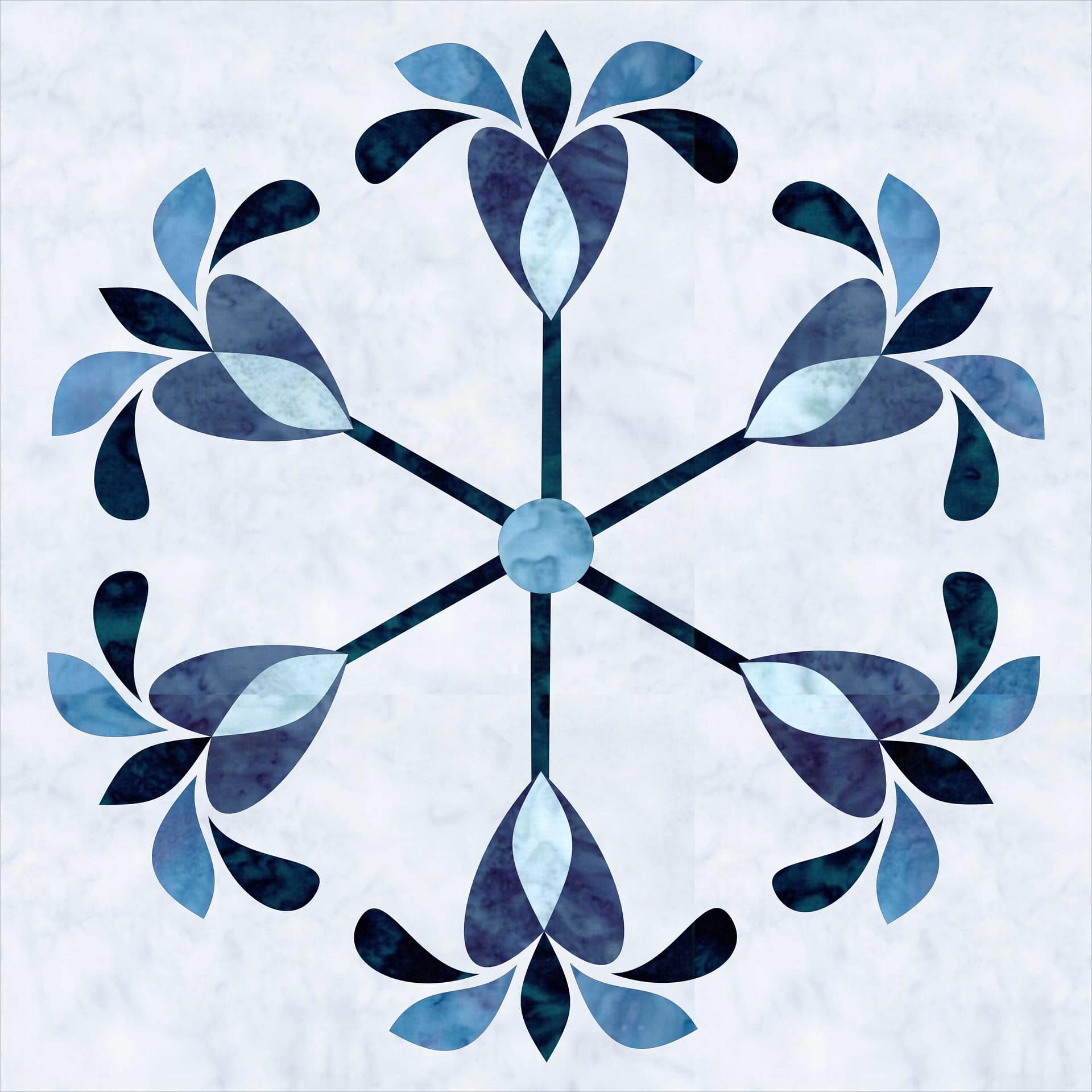 These shapes carry the most visual weight. They repeat consistently around the block and form the core structure. Keeping them in the middle and lighter blues ensures the quilt still reads as blue-first, no matter what else changes.