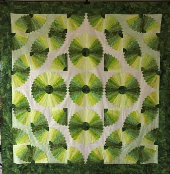 My Dresden plate (nine 9 3/4-inch blades) was finally assembled in an 8 x 8 block quilt! The 10-inch blocks were sewn together in the pattern I had designed. I had several to chose from. Then, 6-inch borders were added to finish it off.