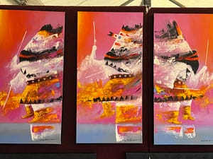 The paintings of Timothy Nevaquaya practically vibrated off the canvas. His work wasn’t the muted earth and gem tones I often expect in Indigenous art. Instead, he layered saturated tints against bold silhouettes, carving vibrant textures into his oils with heavy knife work. The effect was alive, electric, impossible to ignore.