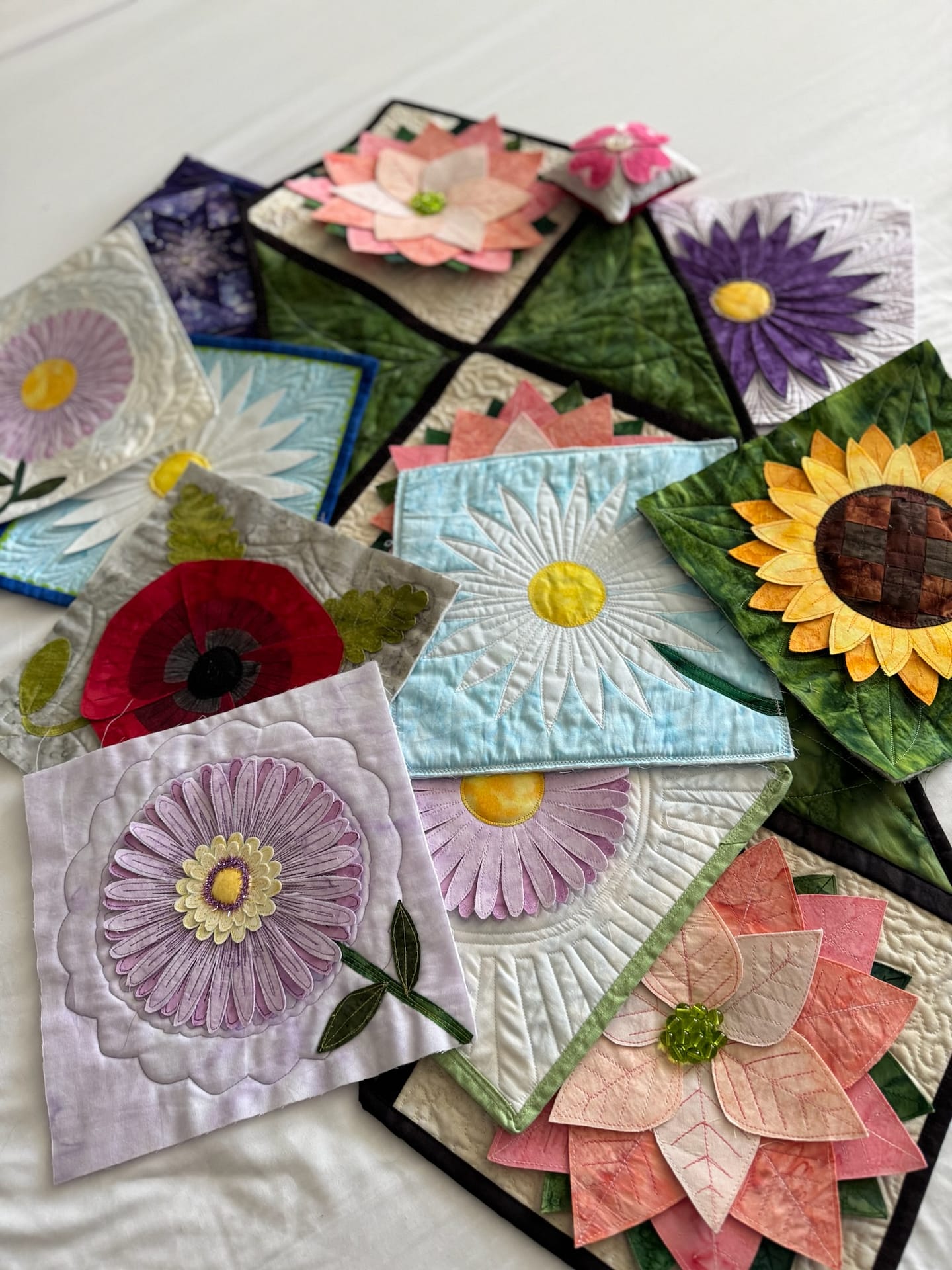 “My own ‘doorway moment’ in fabric: a growing garden of dimensional appliqué blocks. Each one a reminder that what started as a ‘mistake’ has blossomed into a whole new style.”