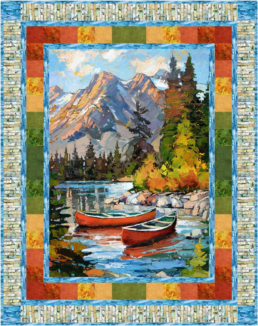 Fall Foliage is built around a stunning landscape panel from Northcott’s Canoe Lake Collection — a red canoe resting at the edge of mountain-fed water, surrounded by trees at peak color. It’s the kind of image that makes you want to pack a thermos and find a trail. The frame does exactly what a good border should: it extends the story. Northcott’s gorgeous gradient fabrics move through fire, orange, sunshine, and yellow before settling into green, leaf, and the cool water blue that anchors the whole design. Autumn leaves meeting the water, in fabric form.