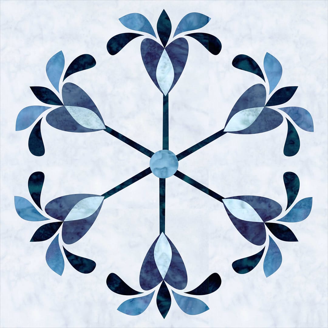 I wanted this second block to reflect those early winter blossoms while still holding onto the snowflake-inspired structure that anchors the Winter Whispers collection. Frozen Flowers finishes at 12″, making it easy to use as a stand-alone block or as part of a larger seasonal project. It works beautifully in pillows, runners, medallions, and sampler-style quilts, and was designed to integrate seamlessly with the rest of the collection.