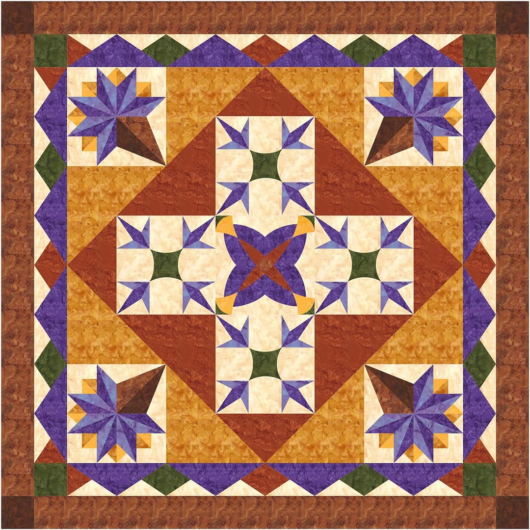 Give thanks was designed for the autumn season, when we reflect on the positive things in our life. Traditional symbols are used in this quilt such as the cornucopia block for bounty and turkey tracks for the star of the feast. With detailed instructions, you can tackle the gentle curves and foundation piecing in the Give Thanks pattern.