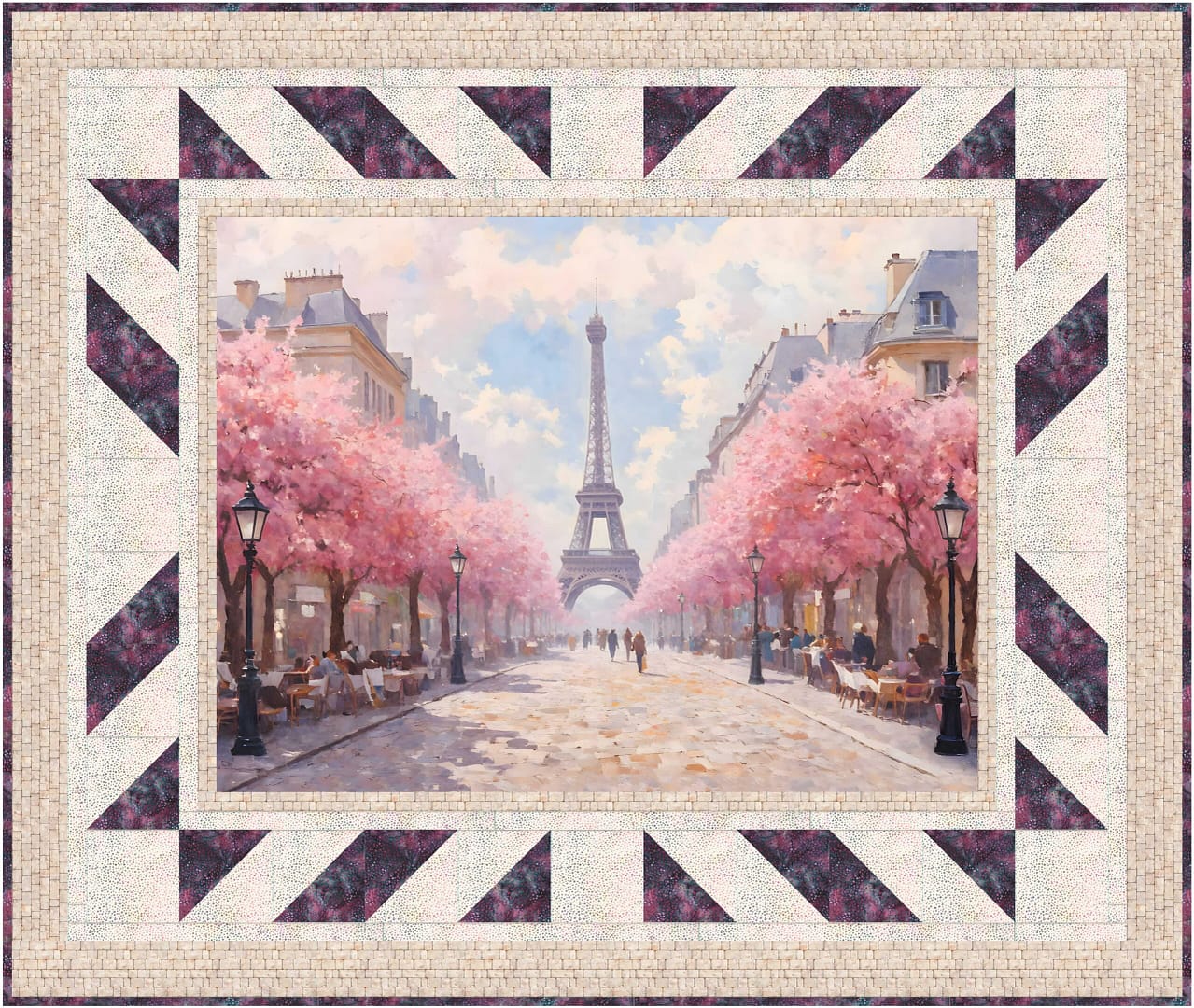 Sur la Rue means “on the road” — but in my mind, it’s a quiet Paris street, a small café table, a warm cup of tea, and a flaky croissant just within reach. This quilt is designed to frame a beautiful Paris panel and let the artwork do the talking, with angled borders that add movement and charm without complicated piecing.