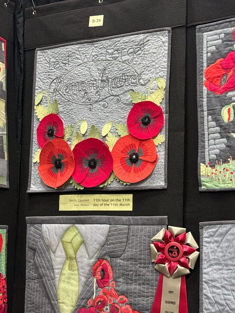 The quilt was inspired by the poppy we typically see on Veterans Day in the US. In Europe, it is known as Remembrance Day or Armistice Day. It marks the end of the fighting in what was called the Great War, or the War to End All Wars. Today, we call it World War I.