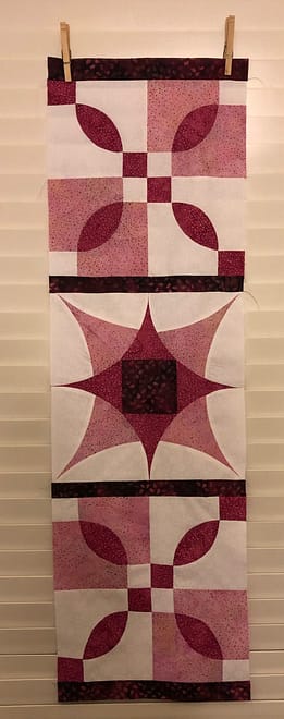 The clues for this mystery are starting to come together today. Two of the Lovers Knot blocks flank the Home Maker Block. Note the Lovers Knot is oriented differently on either side of the Home Maker. Spoiler, this set of blocks is duplicated later in the quilt. The dark fabric from the center of the Home Maker is used for a small sash between the blocks to frame them gracefully.