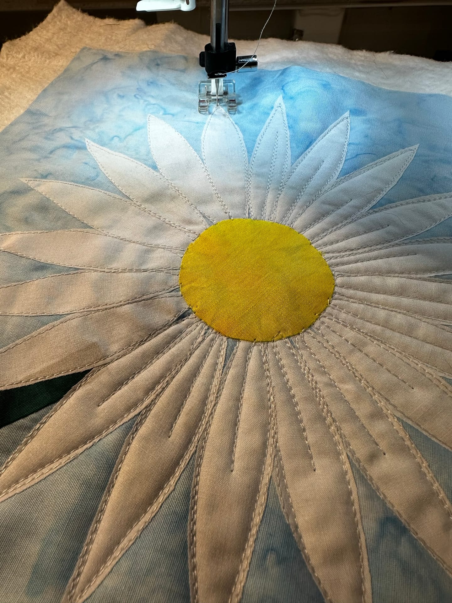 In a 3-D appliqué approach, the background is quilted before the appliqué pieces are added. The quilting creates subtle guidelines and texture that help with placement. Once the base is quilted, the appliqué elements are layered and stitched on top.