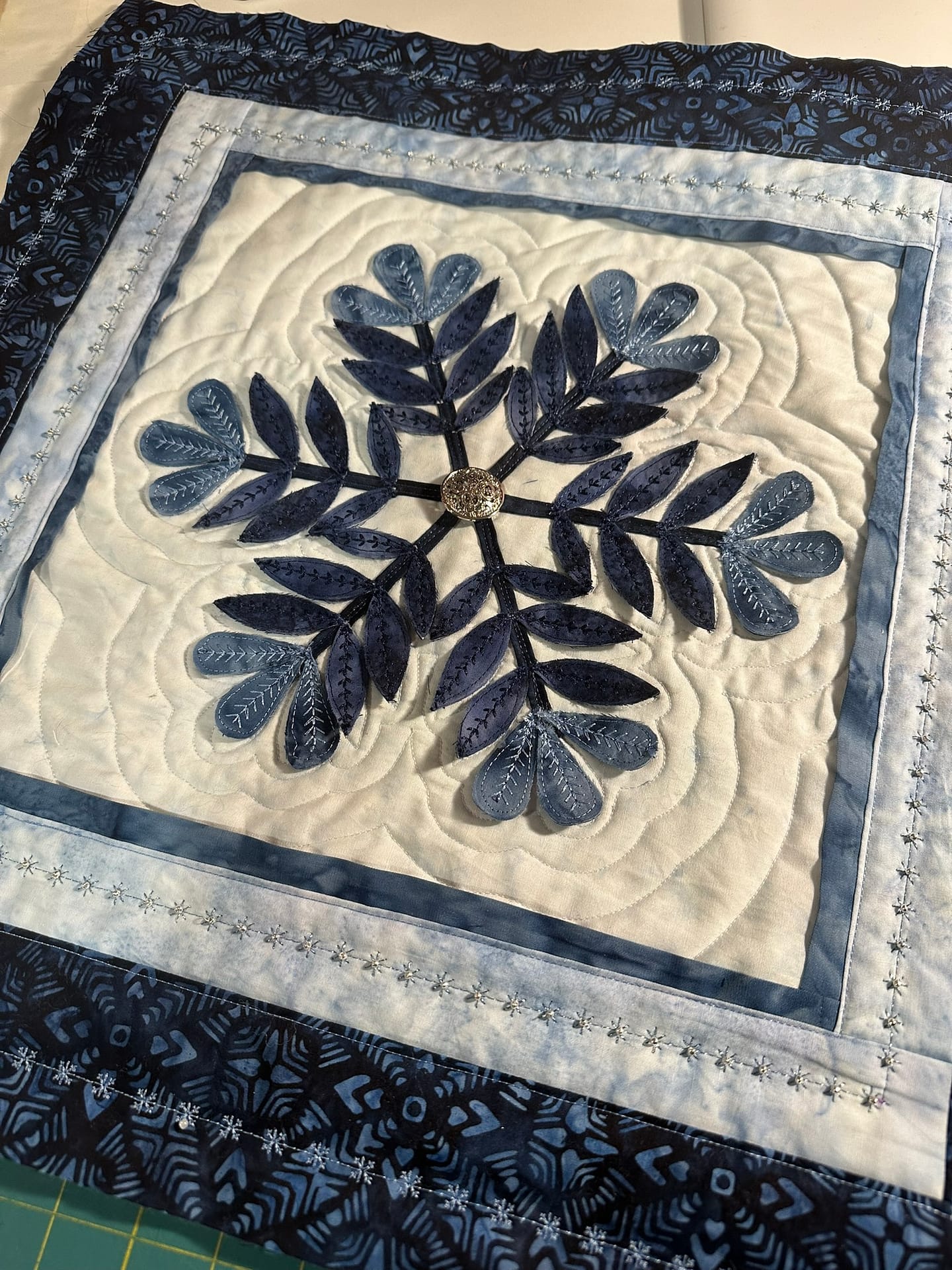 In the same amount of time, I was able to quilt the background for the 3-D version and add borders — before a single appliqué piece was attached.